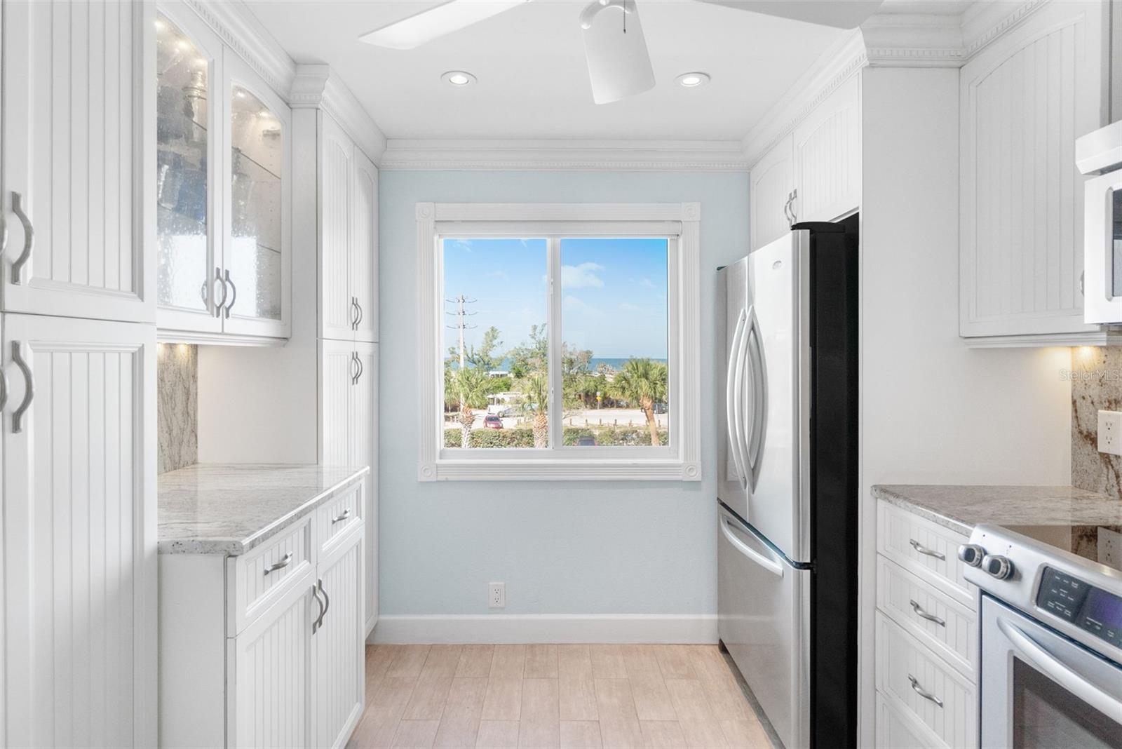 Embrace waterfront living in this end-unit residence in Sunrise Cove, an updated, turnkey-furnished 2-bed/2-bath condo offering 1,228 sq ft of coastal style, just one shared wall, tile flooring and crown molding throughout, abundant closets, and a coveted in-unit washer-dryer. The granite kitchen features high-end stainless appliances, two pantries, and generous cabinetry, while impact-rated windows, plantation-shuttered in both bedrooms, capture spectacular sunrise panoramas over Little Sarasota Bay from the living area and screened lanai and serene sunset Gulf views from the kitchen and guest suite. Extra end-unit windows flood the primary suite and guest room with light; newer systems include an HVAC (2022) and water heater (2021). Community highlights: two heated pools (one Olympic length), lighted tennis/pickleball courts, a freshly renovated clubhouse, fitness and game rooms, barbecue area, kayak launch and optional boat docks, all tended by an on-site crew Monday, Friday, with a funded assessment for new roofs, carports, and dock upgrades under way. On-site management supports 30-day rentals for effortless income potential, while Turtle Beach, three restaurants, and the free Siesta Key Breeze trolley are just steps from your door, delivering the complete island lifestyle and an investment opportunity in one.